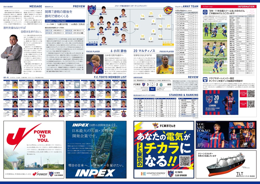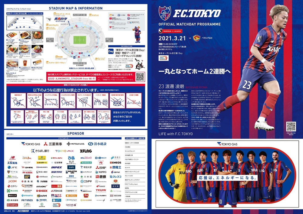 3/21(日) 2021明治安田生命J1リーグ 第6節 vs ベガルタ仙台(13:00キックオフ/味の素スタジアム)のオフィシャルマッチデープログラムについて、下記のとおりご案内いたします。