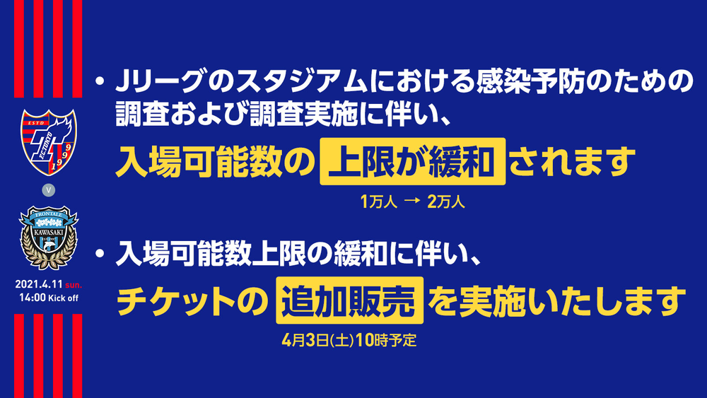 4月11日(日) 2021明治安田生命J1リーグ 第9節 FC東京 vs 川崎フロンターレ(14:00キックオフ/味の素スタジアム)のチケット販売に関してお知らせいたします。