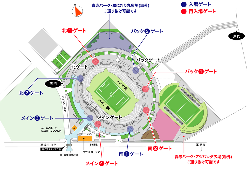 再入場ゲート:メイン4ゲート、バック1ゲート、北1ゲート、南2ゲート(上図参照)