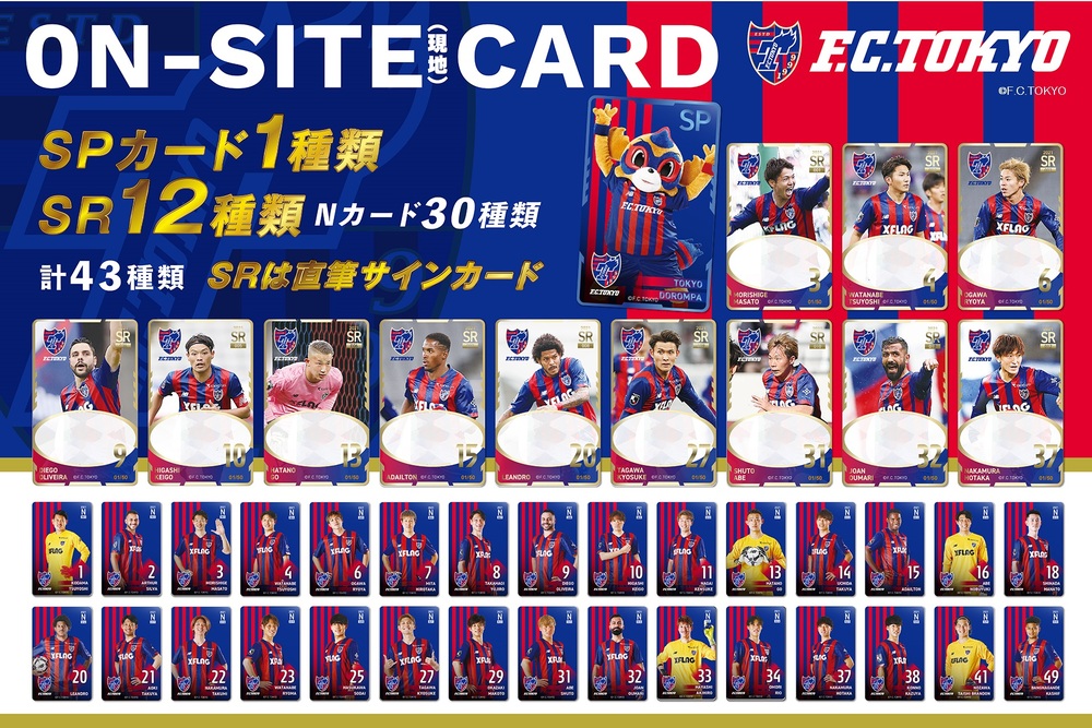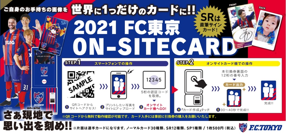 あなたのお手持ちの画像を世界にひとつだけのカードにできるオンサイトカード。プラスティック製のカード表面にはランダムでFC東京の選手画像が入っており、ガチャガチャ感覚で楽しめます!さらに今回は選手サイン入りカード(SR)やシークレットカード(SP)も登場確率UP!!お楽しみに!