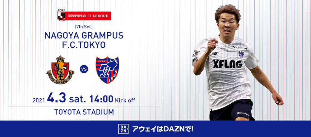 【AWAY GAME情報】4/3(土) 名古屋戦 2021/4/2 試合情報 1.対象試合2021明治安田生命J1リーグ 第7節名古屋グランパス vs FC東京4月3日(土) 14:00キックオフ 2.試合会場豊田スタジアム 3.中継情報【Jリーグオフィシャルブロードキャスティングパートナー】DAZN 4.イベント情報・青赤パークオンラインBefore/After The Match supported by めちゃコミック◇詳細はこちら その他、試合情報はこちら