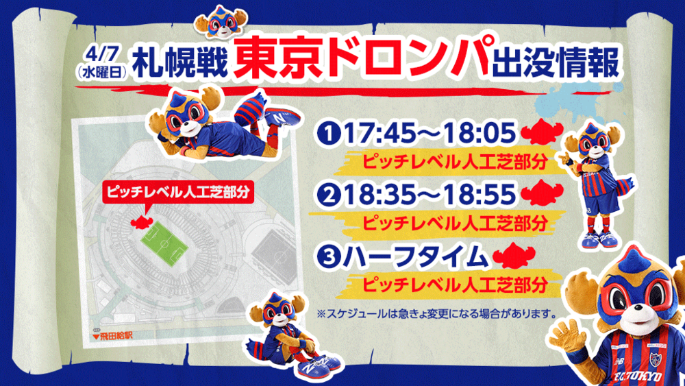 4月7日(水) 2021明治安田生命J1リーグ 第8節 vs 北海道コンサドーレ札幌(19:00キックオフ/味の素スタジアム)に東京ドロンパが下記の通りあらわれます。