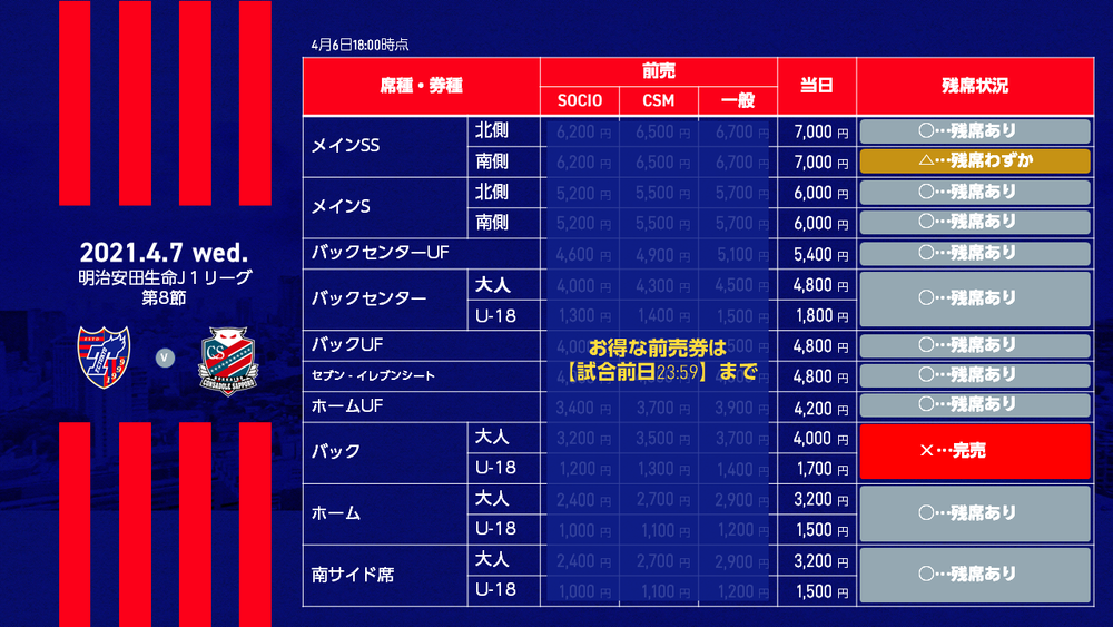 2021明治安田生命J1リーグ 第8節 FC東京 vs 北海道コンサドーレ札幌(19:00キックオフ/味の素スタジアム)の当日券販売につきまして、下記のとおりお知らせいたします。