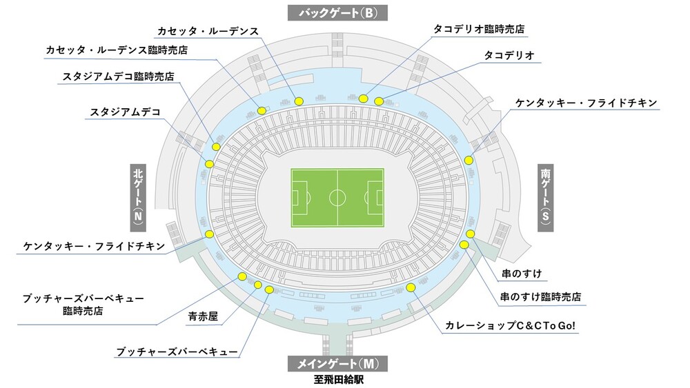 ・「フードコーナー」はスタジアム場外にあります。入場後は再入場ゲート(北1ゲート・バック1ゲート・南2ゲート・メイン4ゲート)ご利用ください。