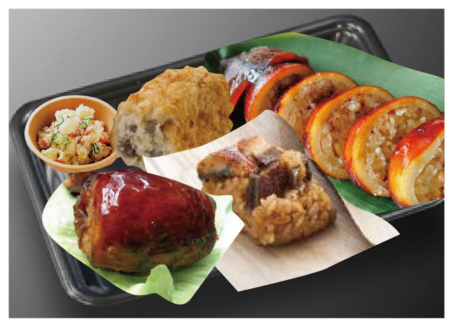 こんな時だから・・全国の名産飯(北海道いかめし・静岡おこわ風うなぎ飯・九州肉巻おにぎり)付け合わせに牛タンコロッケとポテトサラダを詰めました!野菜のお味噌汁と共にどうぞ!