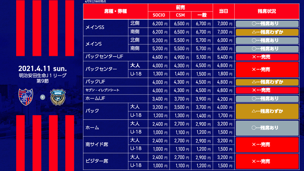 2021明治安田生命J1リーグ 第9節 FC東京 vs 川崎フロンターレ(14:00キックオフ/味の素スタジアム)の当日券販売につきまして、下記のとおりお知らせいたします。