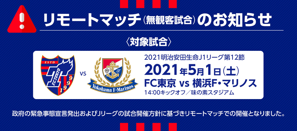 FC東京では、政府の緊急事態宣言発出およびJリーグの試合開催方針に基づき下記のホームゲームがリモートマッチ(無観客試合)での開催となりました。