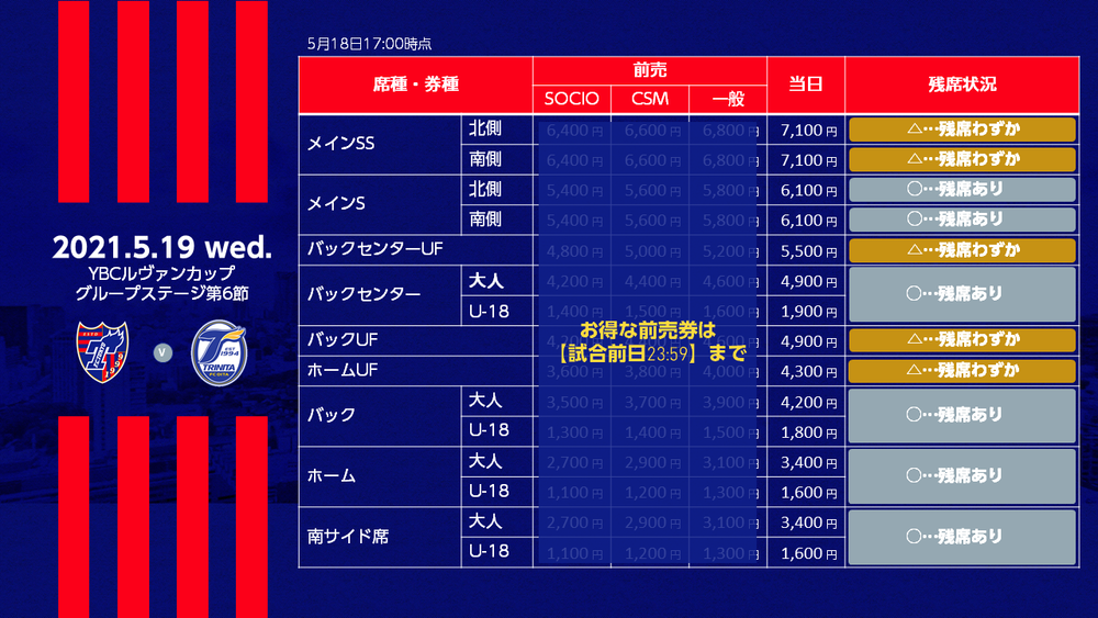※試合当日に会場での当日券販売はいたしません。チケットFC東京(Jリーグチケット)のみでの販売といたします。