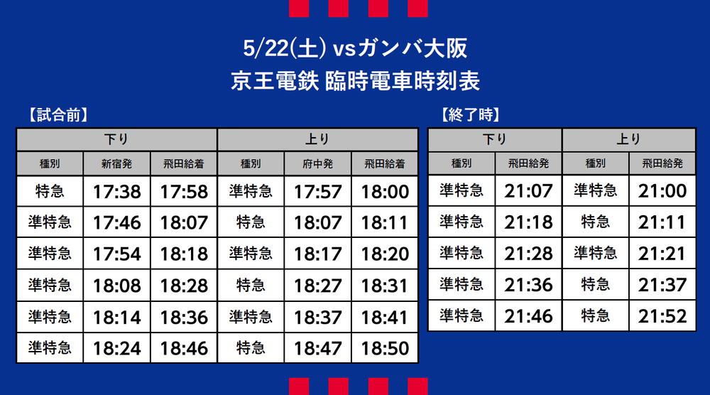 5月22日(土) 2021明治安田生命J1リーグ 第15節 vs ガンバ大阪(19:00キックオフ/味の素スタジアム)にて運行される臨時交通アクセス(鉄道)についてご案内いたします。