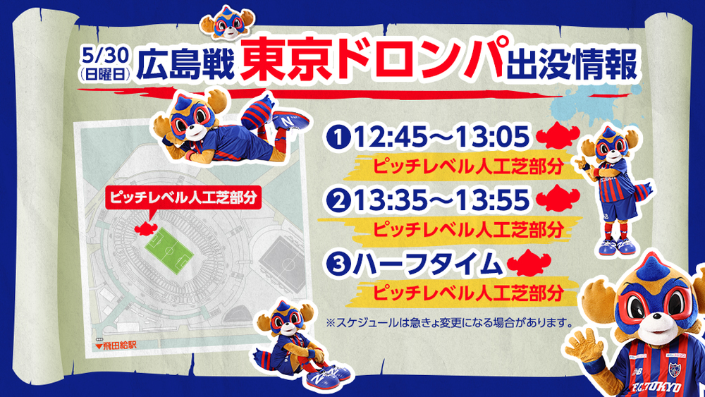 5月30日(日) 2021明治安田生命J1リーグ 第17節 vs サンフレッチェ広島(14:00キックオフ/味の素スタジアム)に東京ドロンパが下記の通りあらわれます。