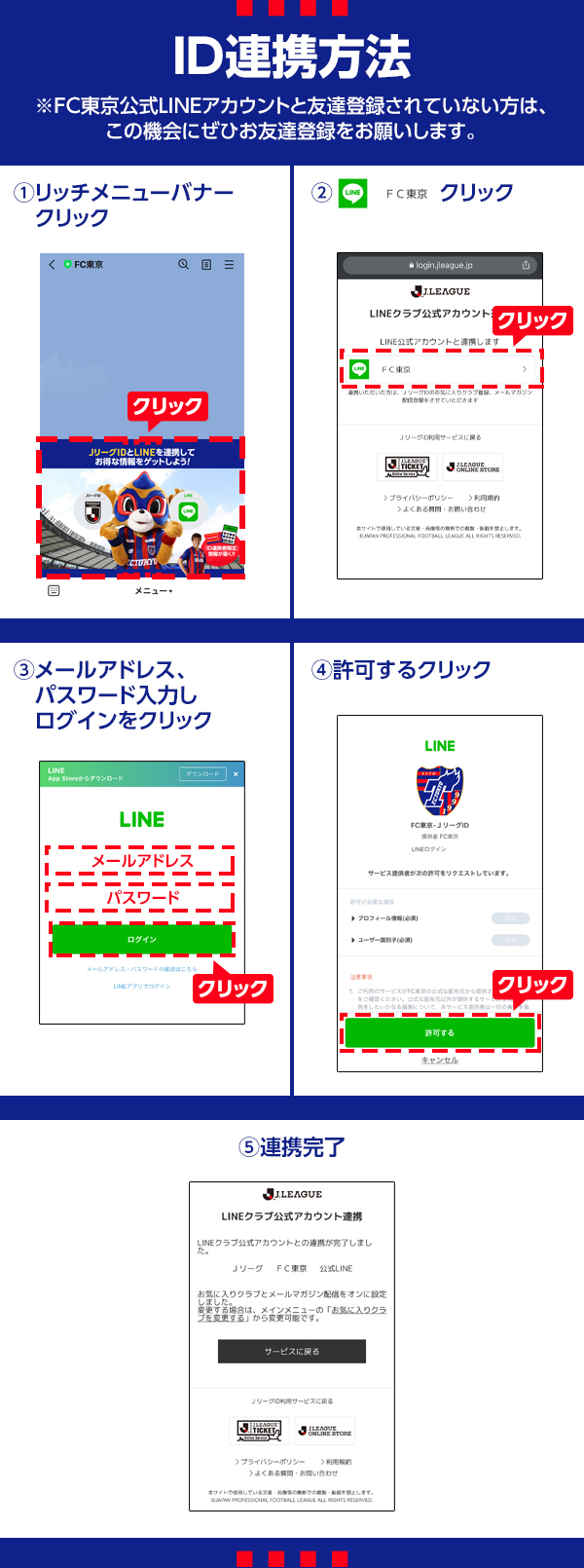 FC東京公式LINEアカウント内でJリーグIDと連携すると、FC東京の情報がもっと便利にもっと楽しく届きます。