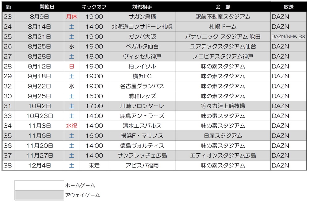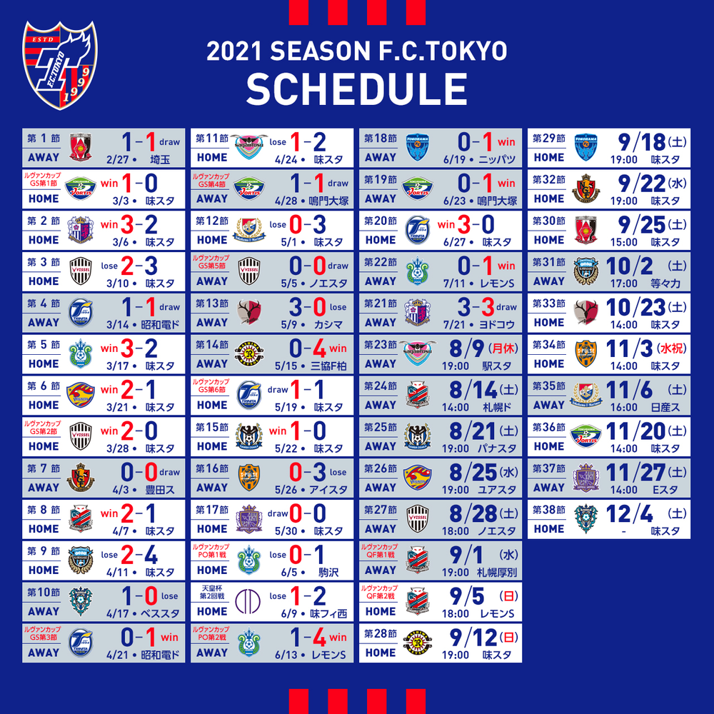 2021明治安田生命Jリーグ 後半日程発表のお知らせ 2021/8/4 クラブからのお知らせ 2021明治安田生命J1リーグ の後半日程につきまして、下記のとおり決定いたしましたので、お知らせいたします。 □2021明治安田生命J1リーグ また、2021シーズンの後半年間チケットについて、クラブとして販売を検討して参りましたが、現在の様々な状況を踏まえた結果、販売しないことに決定いたしましたので、あわせてお知らせいたします。購入をご検討されていたみなさまには申し訳ございませんが、ご理解賜りますと幸いです。