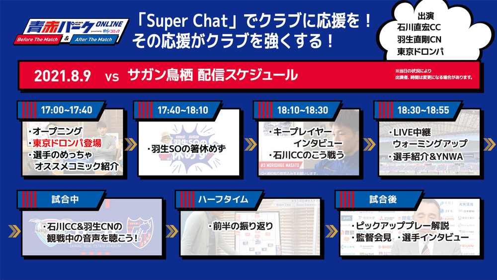 8/9(月休)鳥栖戦『青赤パークオンラインBefore/After The Match presented by めちゃコミック』開催のお知らせ