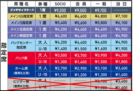 また、「ビジター席」のチケットは販売しないため、ビジターチームを応援する方はご来場いただけません。ビジターチームのユニフォーム・グッズを着用しての入場・観戦および応援はできませんので、あらかじめご了承ください。