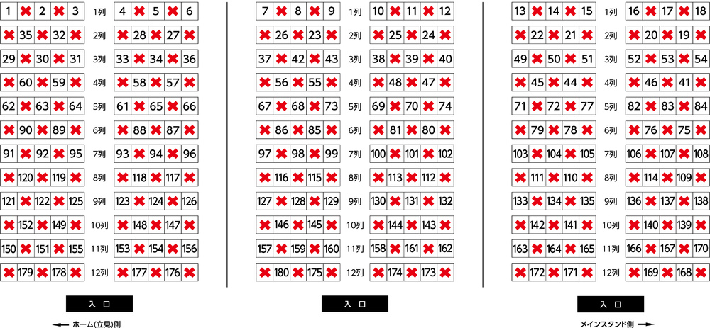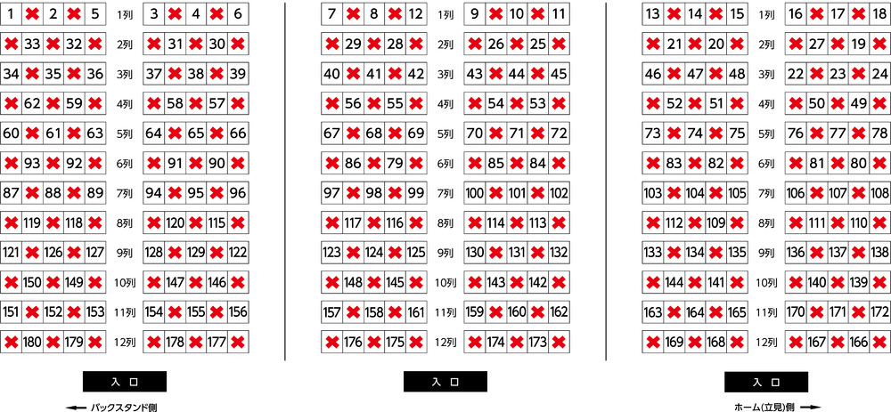 ただし、スタジアムの構造上前後が多少重なる席がございます。予めご了承ください。