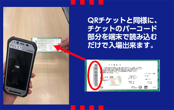 今後は、紙チケットに記載されている二次元バーコードを入場認証端末で読み取ることにより、入場認証を行います。