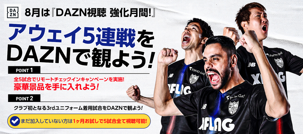 8月アウェイ5連戦は『DAZN視聴強化月間!』リモートチェックインキャンペーンを実施! ぜひDAZNでFC東京の試合を観戦し豪華景品を手に入れよう!