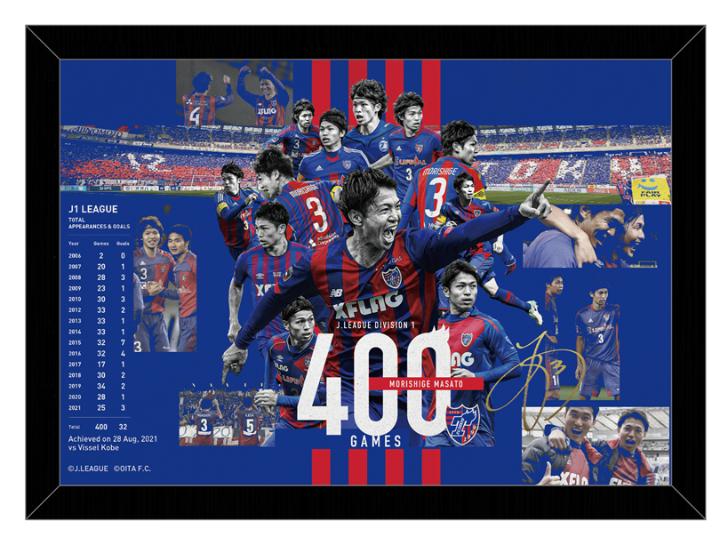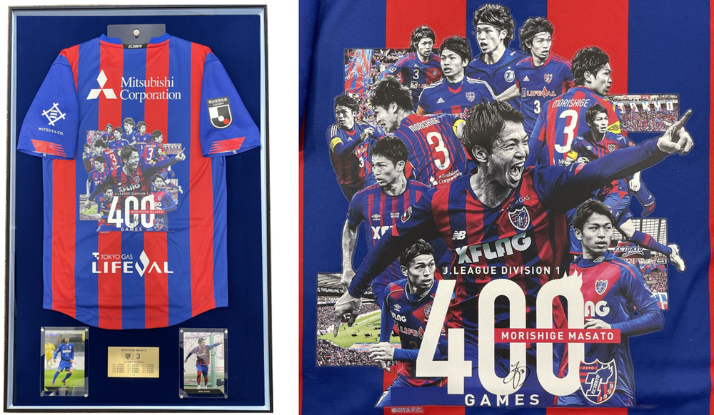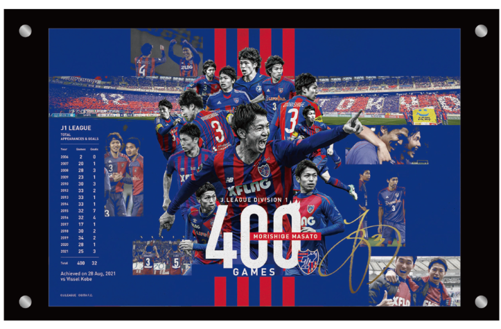 J1リーグ初出場の試合(2006年3月12日大分トリニータ対サンフレッチェ広島)と、400試合出場達成試合(2021年8月28日FC東京対ヴィッセル神戸)の写真が入り、森重選手がこれまで歩んできた功績を称える特別な商品となります。