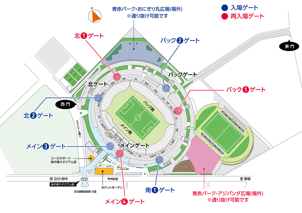 再入場ゲート:メイン4ゲート、北1ゲート、バック1ゲート(上図参照)