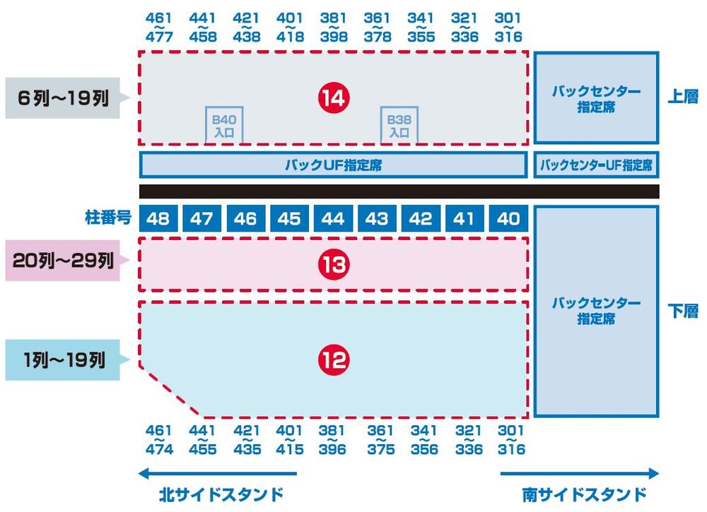 ・メインスタンド下層のメインS指定席(北側・南側)より中央寄りのそれぞれ2ブロック合計4ブロックとなります。