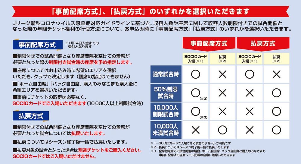 Jリーグ新型コロナウイルス感染症対策ガイドラインに基づき、収容人数や座席に関して収容人数制限付きでの試合開催となった際の年間チケット権利行使方法について、お申込み前に「事前配席方式」、「払戻方式」のいずれかを選択いただきます。