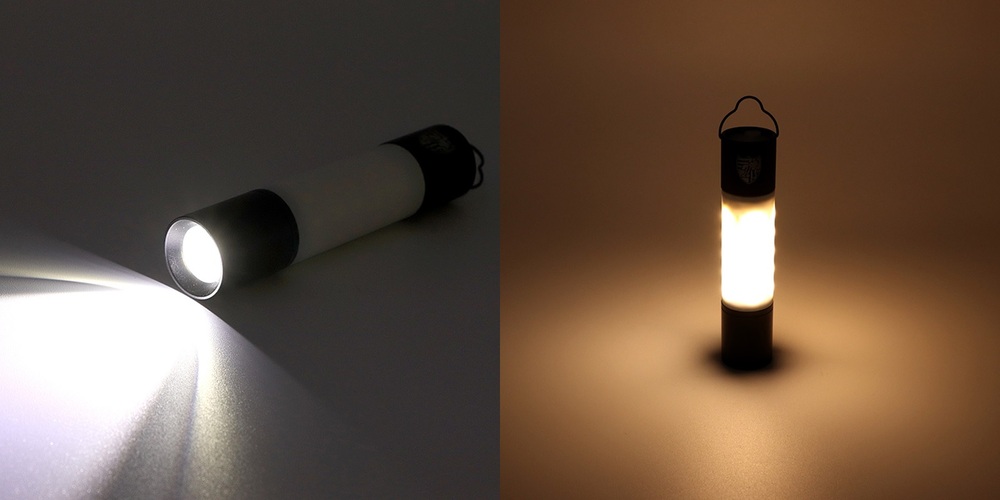 高輝度LEDのフラッシュライトと銅部分に50個(温白色25個、電球色25個)のLEDを搭載し、ランタンとしても使用できる2WAYのコンパクトライトです。フラッシュライトの部分は、ズームさせることで最長100m先まで照らすことが可能です。2500mAhのバッテリーは緊急時に携帯などへの充電もでき、アウトドアや災害時に適したライトです。