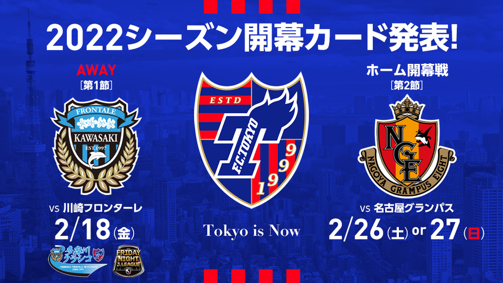 2022明治安田生命J1リーグ開幕カード決定! 2021/12/24 クラブからのお知らせ 2022明治安田生命J1リーグの第1節、第2節の対戦カードが決定いたしましたので、お知らせいたします。 なお、会場・キックオフ時刻などの詳細は決まり次第、試合日程欄にてお知らせいたします 【第1節】・対戦カード:川崎フロンターレ vs FC東京・開催日:2月18日(金) 【第2節】 ※ホーム開幕戦・対戦カード:FC東京 vs 名古屋グランパス・開催日:2月26日(土)or27日(日)