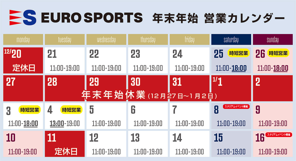 ユーロスポーツ味の素スタジアム店『営業時間変更及び年末年始休業』のお知らせ