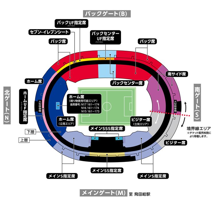 ※ビジターチームのユニフォーム・グッズの着用、およびビジターチームの応援ができる席種は上記の「メインSS指定席 南側」、「メインS指定席 南側」、「ビジター席」の3席種となり、それ以外の席種は全てFC東京の応援席となります。
