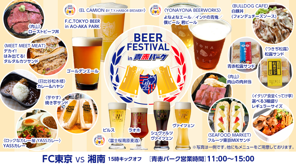 青赤パークでしか飲むことのできない「EL CAMION BY T.Y.HARBOR BREWERY」の『F.C.TOKYO BEER in AO-AKA PARK』をはじめ、「YONAYONA BEERWORKS」が提供する軽井沢のクラフトビール『よなよなエール』、山梨県のブルワリー「富士桜高原麦酒」の『シュヴァルツヴァイツェン』など、一つの会場でさまざまな地ビールをお楽しみいただけます!