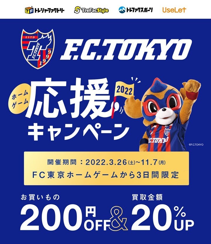 クラブスポンサー「株式会社トレジャー・ファクトリー」が運営するトレファクの対象店舗及びリユース関連サービスにて『FC東京応援キャンペーン2022』が実施されますのでお知らせいたします。