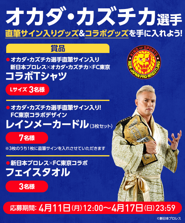 4月10日(日)2022明治安田生命J1リーグ 第8節 FC東京vs浦和レッズの試合会場にスペシャルゲストとしてご来場いただいた新日本プロレス IWGP世界ヘビー級王者のオカダ・カズチカ選手の直筆サイン入りグッズやコラボグッズが当たるキャンペーンを期間限定で実施します!