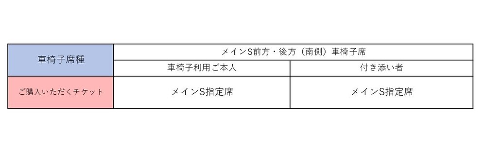 ※メインS前方(北側・南側)車椅子席は障がい者手帳をお持ちの方を優先的にご案内しております。当日のご利用状況によって、メインS後方(北側・南側)車椅子席へのご案内になりますので予めご了承ください。