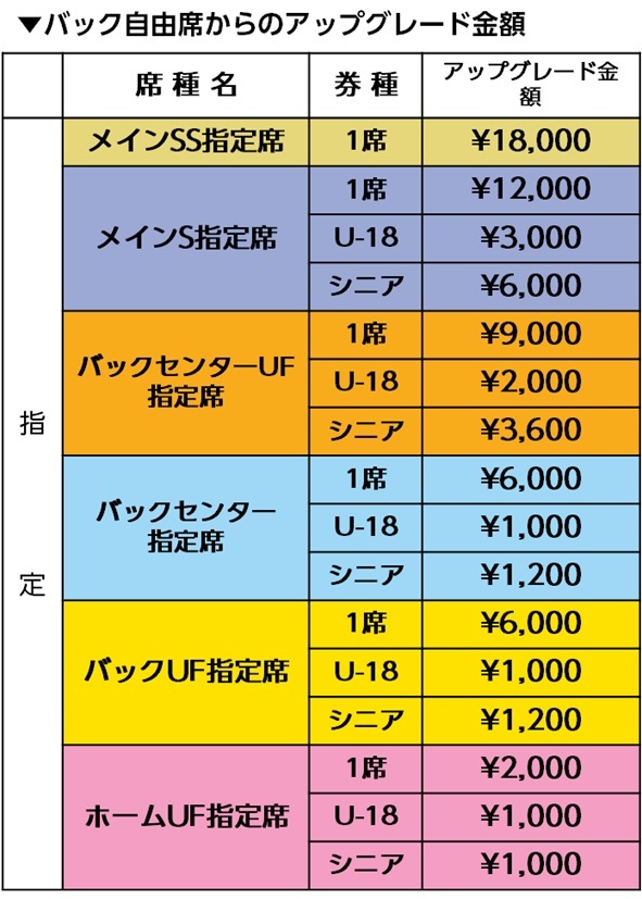 ・アップグレードをご希望の方は、7月17日(日)ジュビロ磐田戦以降の試合の現席種(自由席)をリセール・譲渡しないようにお願いいたします。