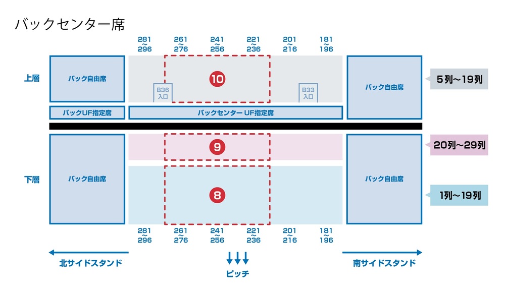 バックセンター指定席の座席位置は年間指定席エリア内8~10(いずれも座席番号「221~236」、「241~256」、「261~276」)の3エリアとなります。