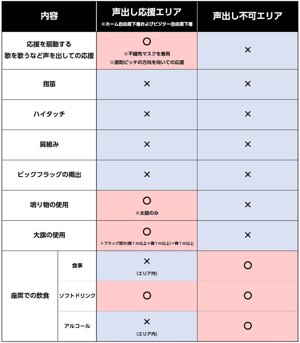 また本試合は「声出し応援運営検証対象試合」となり、一部座席を「声出し応援エリア」といたします。従来とは異なる観戦ルールおよびガイドラインの下での開催となります。ご来場予定のお客様におかれましては、観戦ルールとガイドラインの遵守をお願いいたします。