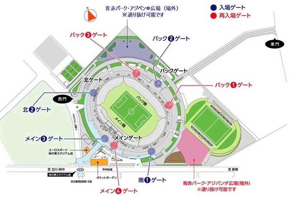 再入場ゲート:メイン4ゲート、バック1ゲート、バック3ゲート(上図参照)