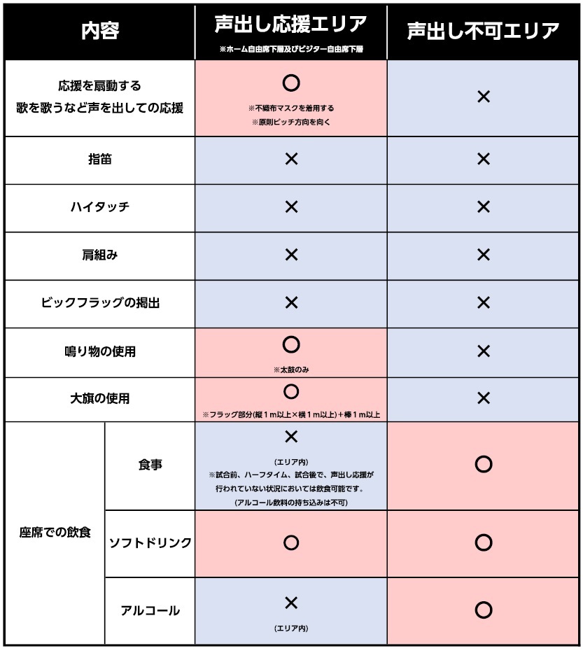 また本試合は「声出し応援運営検証対象試合」となり、一部座席を「声出し応援エリア」といたします。従来とは異なる観戦ルールおよびガイドラインの下での開催となります。ご来場予定のお客様におかれましては、観戦ルールとガイドラインの遵守をお願いいたします。