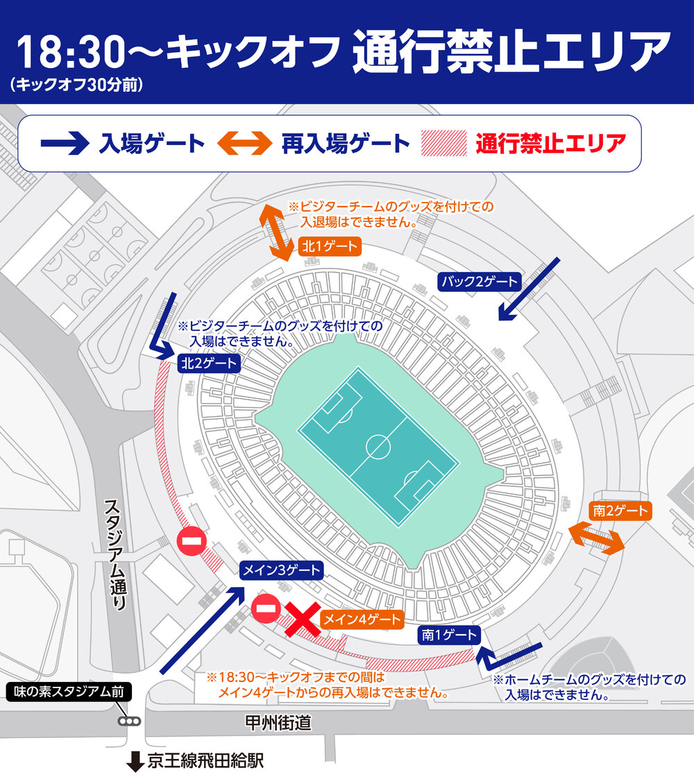 上記の通行禁止に伴い、18:30~キックオフまでの間、メイン4ゲートからの再入場はできません。