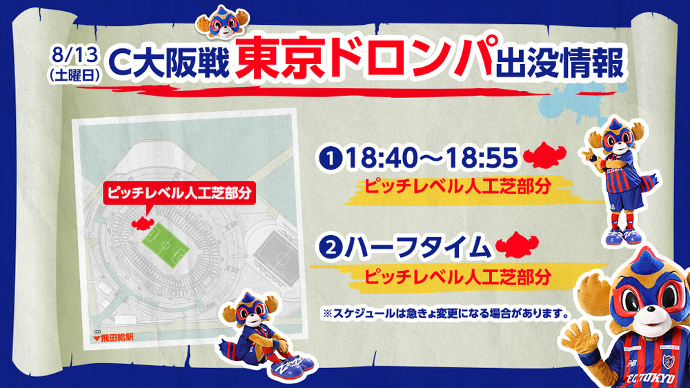 8月13日(土) 2022明治安田生命J1リーグ 第25節 vs セレッソ大阪(19:00キックオフ/味の素スタジアム)に東京ドロンパが下記の通りあらわれます。