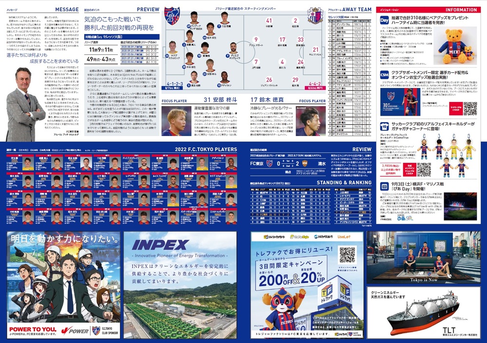 ※セレッソ大阪戦のオフィシャルマッチデープログラムの情報は、印刷時点での情報となります。台風8号の影響により、青赤パーク情報など一部変更されている情報がございます。予めご了承ください