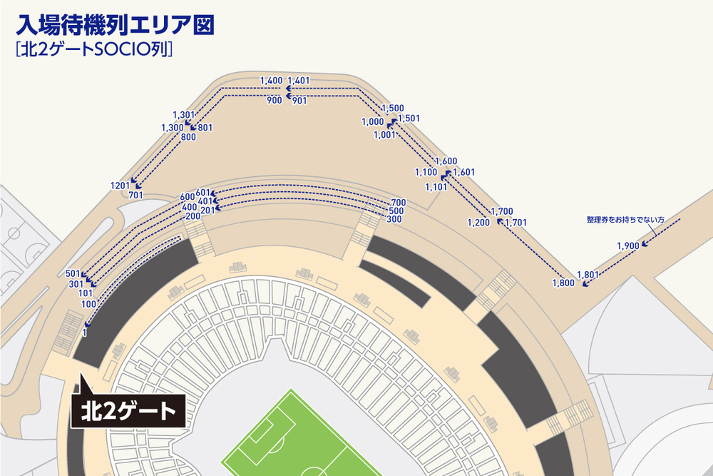 開門後からキックオフの時間に合わせてご来場いただいた場合でも、お座りいただく座席はございますので、必ずしも並ぶ必要はありません。