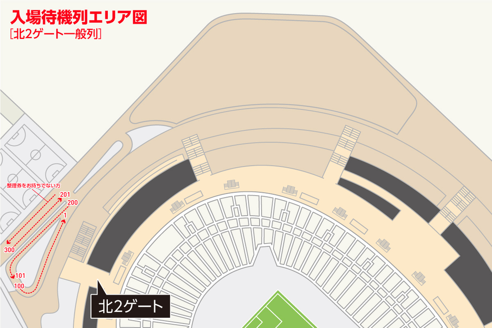 試合開催当日9:00にメインゲート、バックゲートの待機列エリアにお並びください。場所取り後は待機列を離れることが可能です。