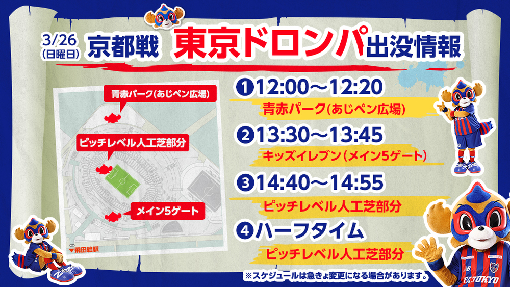 3月26日(日) 2023 JリーグYBCルヴァンカップ グループステージ第2節 vs京都サンガF.C.(15:00キックオフ/味の素スタジアム)に東京ドロンパが下記の通りあらわれます。