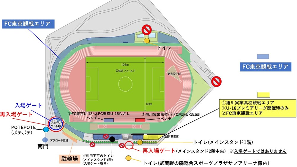 ※再入場ゲートであるメインスタンド中央ゲートを出て武蔵野の森総合スポーツプラザサブアリーナ棟内指定のトイレをご利用ください。