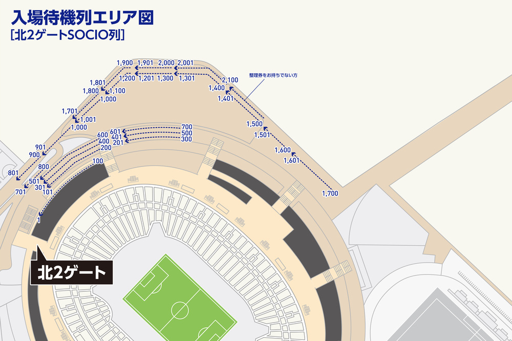 開門後からキックオフの時間に合わせてご来場いただいた場合でも、お座りいただく座席はございますので、必ずしも並ぶ必要はありません。