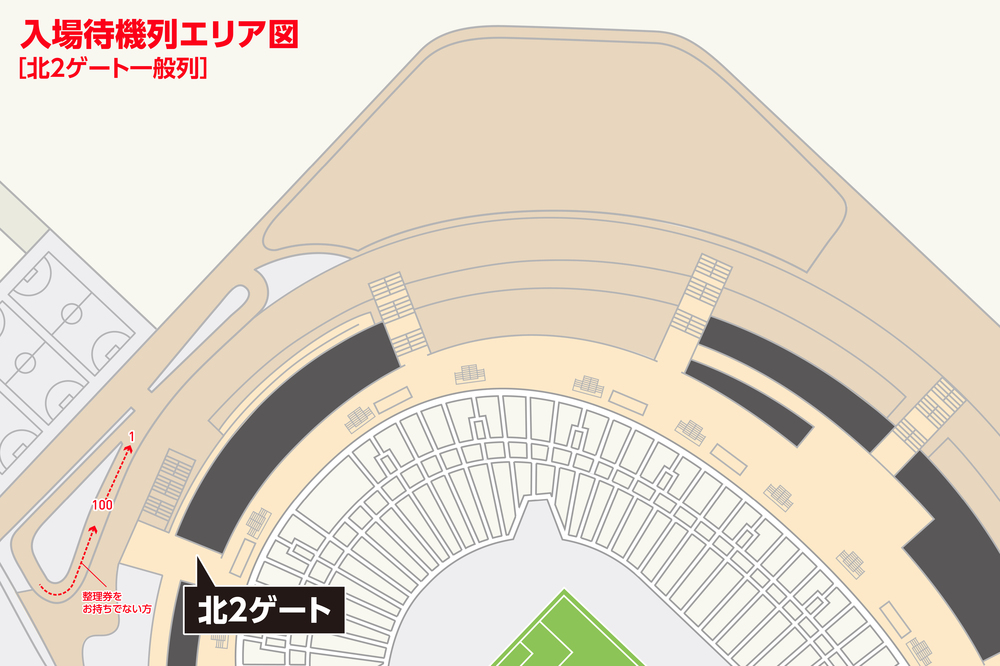 試合開催当日9:00にメインゲート、バックゲートの待機列エリアにお並びください。場所取り後は待機列を離れることが可能です。