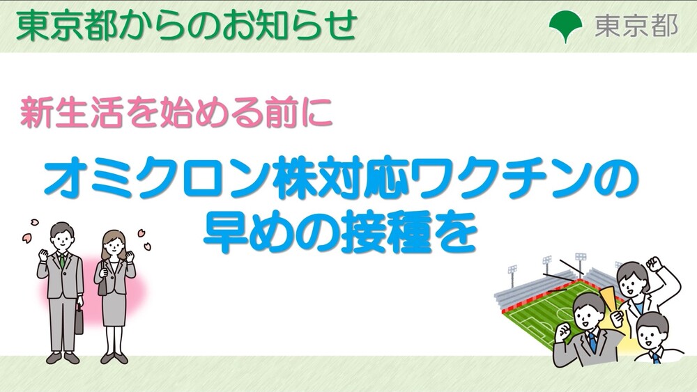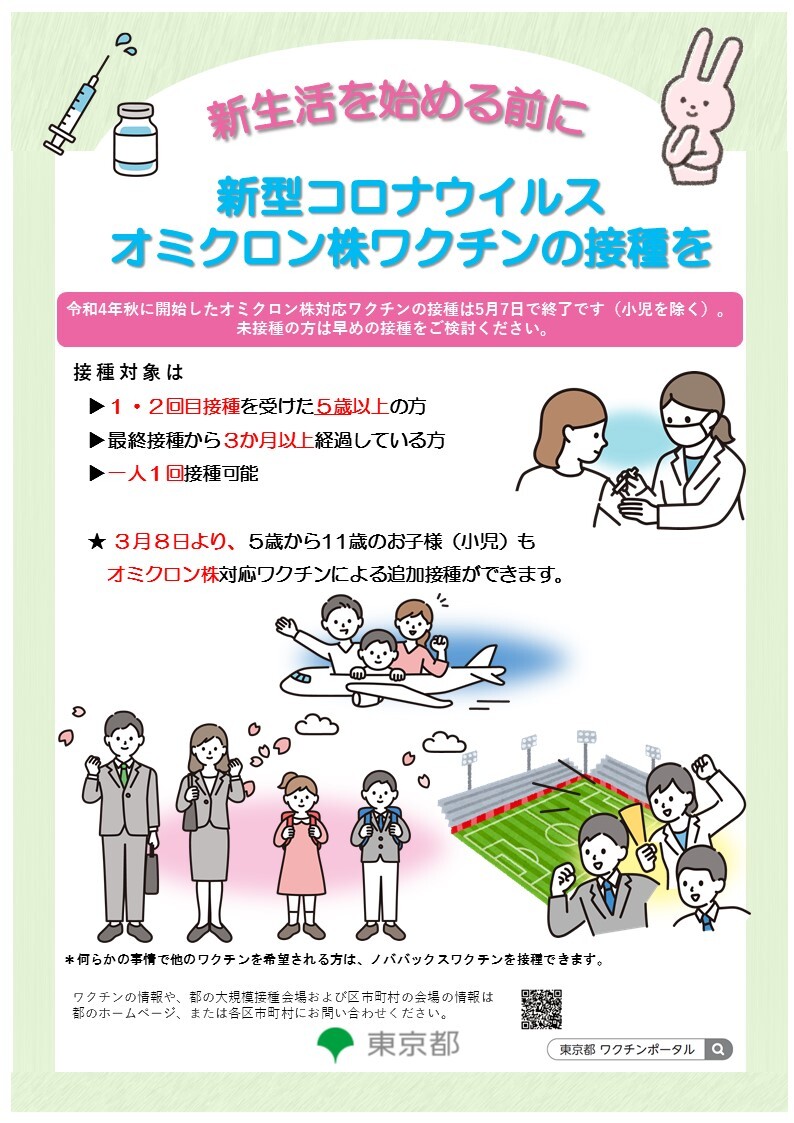 現在、東京都では令和4年秋に開始したオミクロン株対応ワクチンの接種促進に努めています。オミクロン株対応ワクチンは、従来型ワクチンを上回る重症化予防効果があることや、今後の変異株に対しても従来型ワクチンより効果が高いことが期待されています。未接種の方は、ぜひこの機会に接種をご検討ください。また令和5年度も、すべての方に自己負担なしで新型コロナワクチンを接種いただけます。