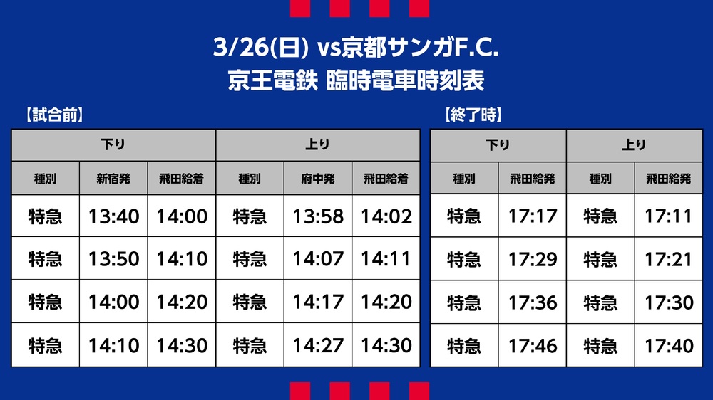 3月26日(日) 2023 JリーグYBCルヴァンカップ グループステージ 第2節 vs 京都サンガF.C.(15:00キックオフ/味の素スタジアム)にて運行される臨時交通アクセス(鉄道)、シャトルバス・路線バスについてご案内いたします。