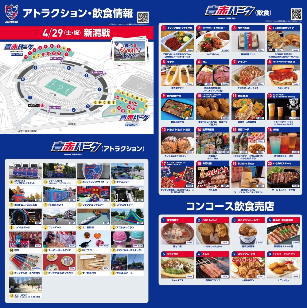 4月29日(土祝)アルビレックス新潟戦の青赤パーク supported by TOKYO GAS(場外)およびスタジアム内コンコース(場内)売店にて販売するフードメニューとなります。